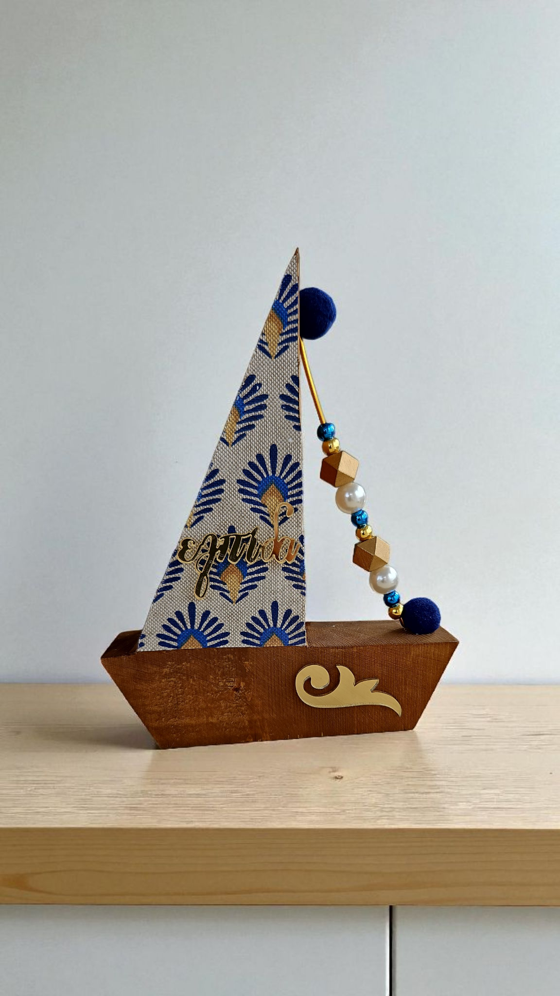 Χειροποίητο ρουστίκ καράβι, φτιαγμένο με φυσικά υλικά και λεπτομέρεια. Ένα ζεστό διακοσμητικό που συμβολίζει ταξίδι, τύχη και νέα ξεκινήματα.