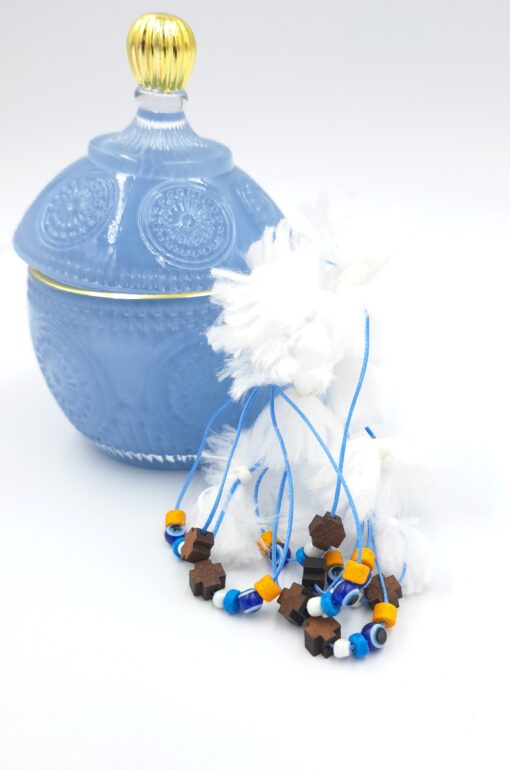 Μαρτυρικό κολιέ γαλάζιο με μάτι και πολύχρωμες χάντρες λευκή φούντα και σταυρό.