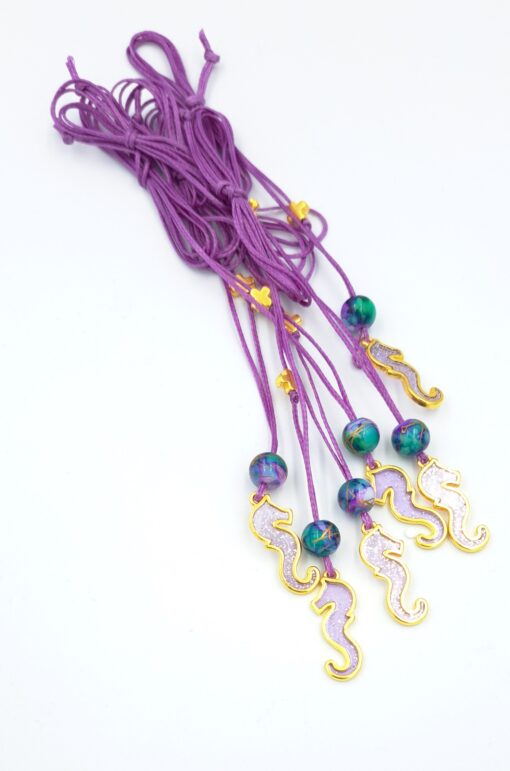 Μαρτυρικό κολιέ, κορδόνι λιλά, ιππόκαμπος λιλά, σταυρός.