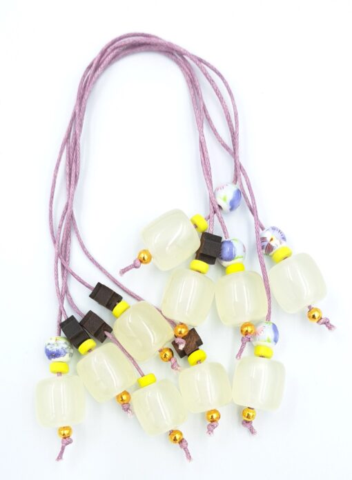 Μαρτυρικό μπεγλέρι, λιλά απόχρωση, χάντρες λευκές, κίτρινες ροδέλες, κεραμική χάντρα, σταυρός καφέ ξύλινος.