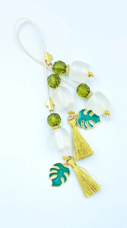 Μαρτυρικό μπεγλέρι εκρού, χάντρες εκρού -λαδί, ροδέλες χρυσό χρώμα, φτερό πράσινο στοιχείο, φούντα χρυσή, σταυρός.
