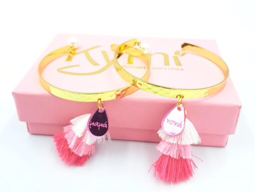 Μπρασελέ με τριπλή φούντα λευκό-ροζ-φούξια, για την μαμά, την νονά, την θεία, την αδερφή και την γιαγιά..