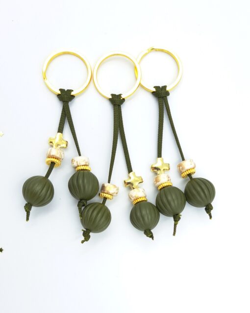 Μαρτυρικό μπρελόκ, πράσινη απόχρωση, χάντρες πράσινες, ροδέλες λευκές, σταυρός.