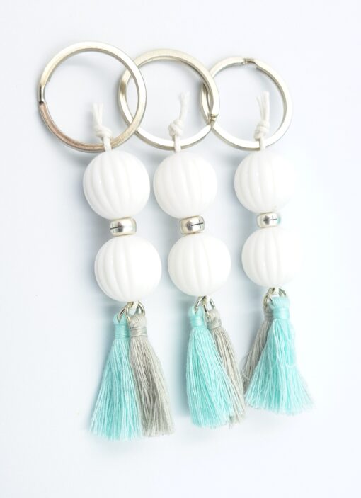 Μαρτυρικό μπρελόκ λευκές χάντρες, φούντες γκρι-βεραμάν, σταυρός.