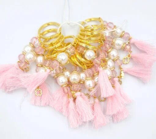 Μαρτυρικό μπρελόκ, χάντρες ροζ, λευκή πέρλα, φούντα ροζ, σταυρός.