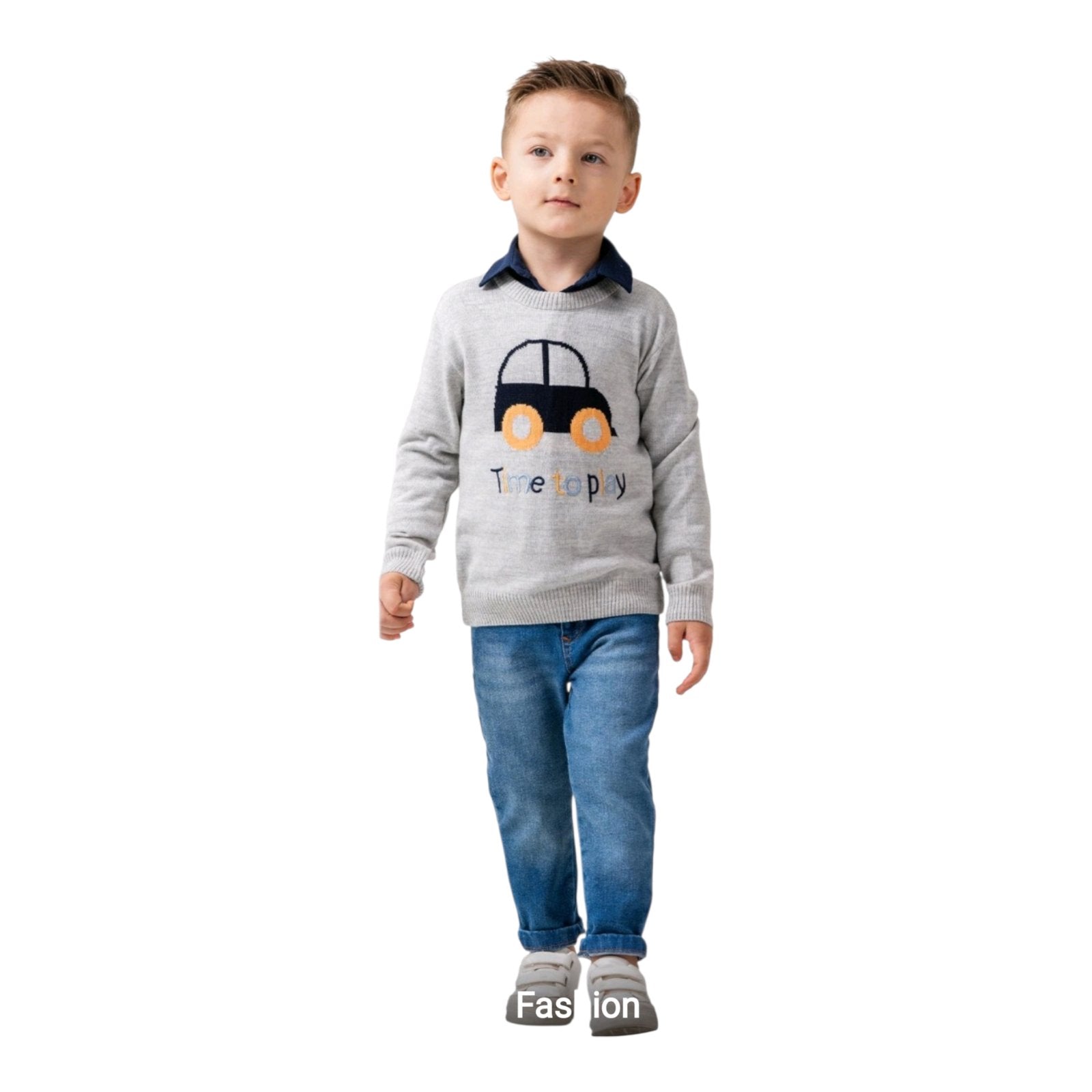 ✔ Πλεκτό πουλόβερ σε γκρι χρώμα με σχέδιο αυτοκινητάκι “Time to Play”