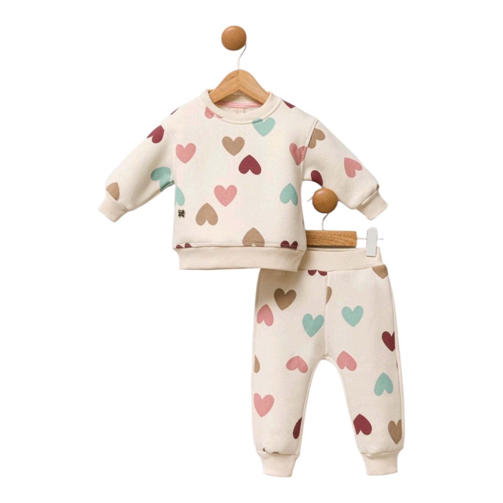 Ένα γλυκό, άνετο και ζεστό σετ για κοριτσάκια! Η μπλούζα και το παντελόνι διαθέτουν all-over print με πολύχρωμες καρδιές σε παστέλ αποχρώσεις, πάνω σε εκρού βάση.